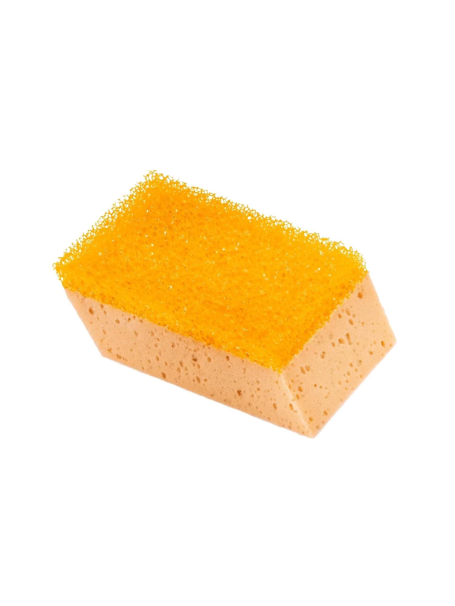 Двусторонняя структура: один слой — мягкий пористый материал для промывки и деликатной очистки, второй — абразивный для удаления клея, краски, стойких загрязнений.