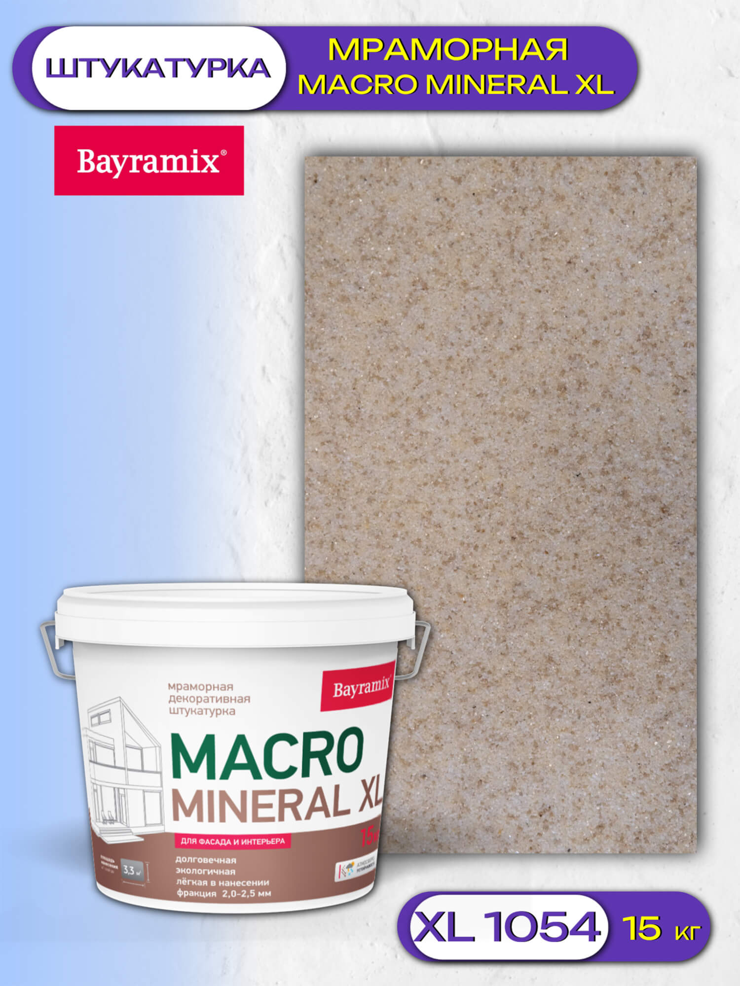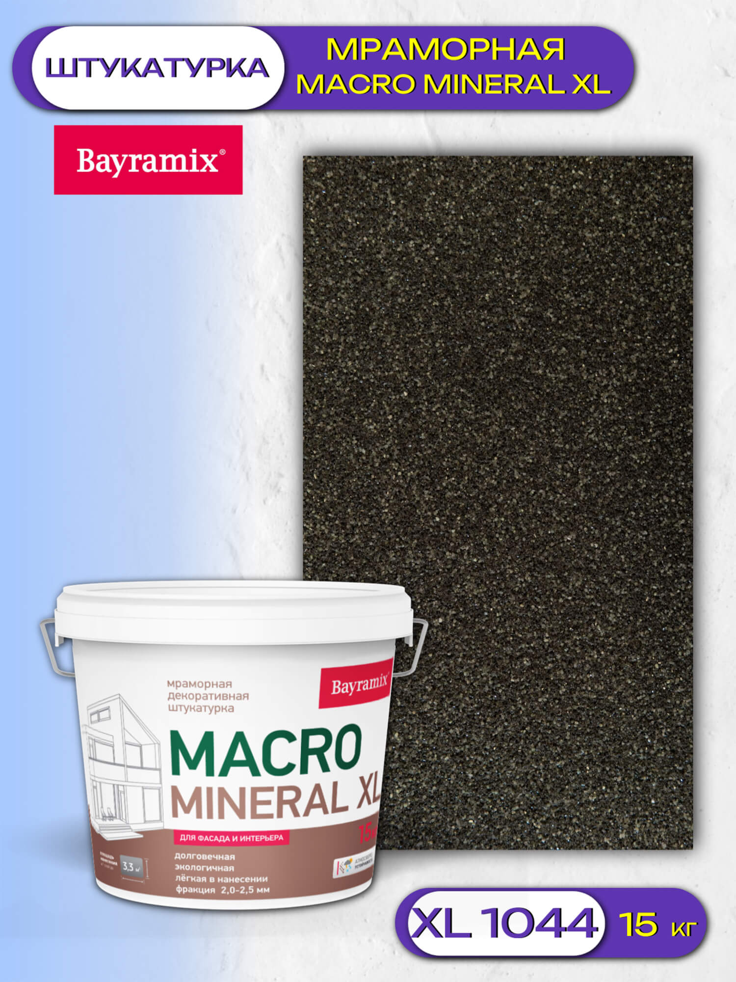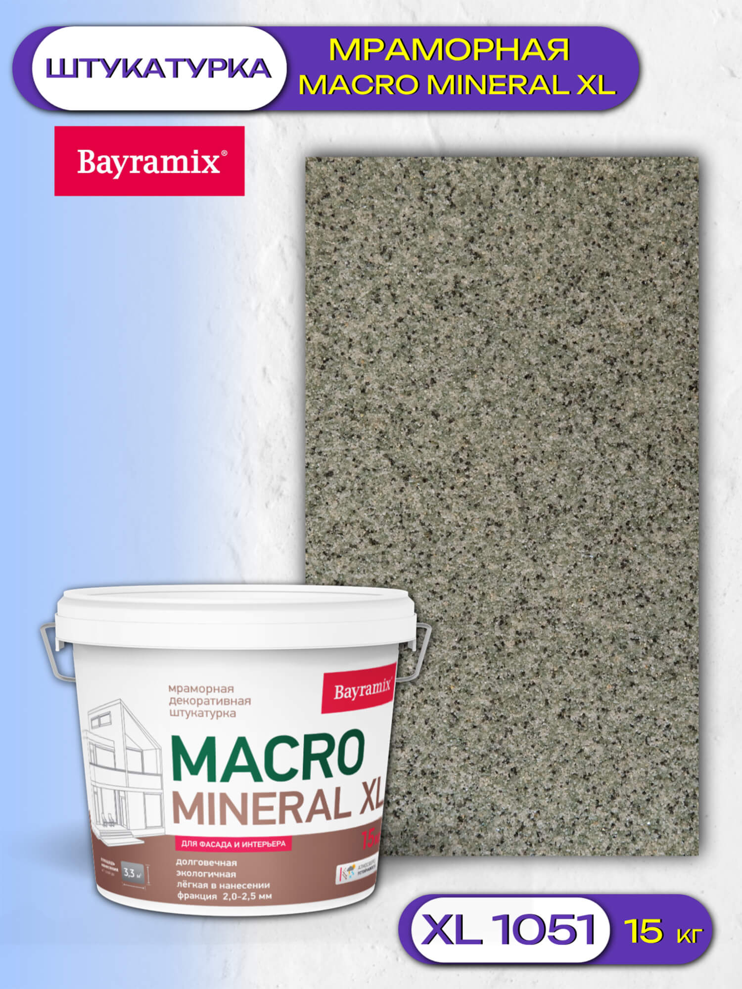 Декоративная мраморная штукатурка Macro Mineral Bayramix является инновационным материалом, способным создать впечатление натурального камня благодаря структуре крупной крошки мрамора, формирующей эффектное покрытие.