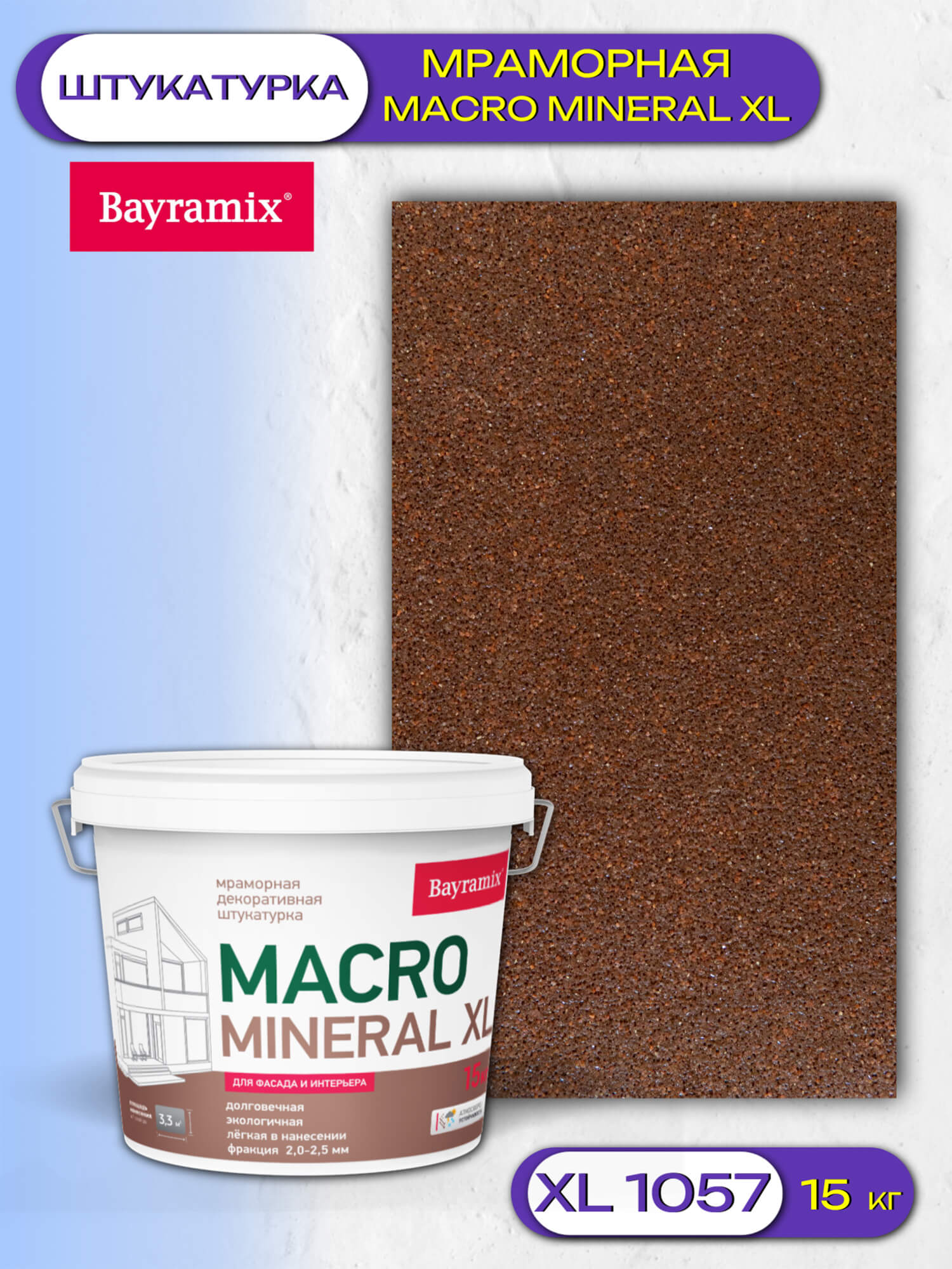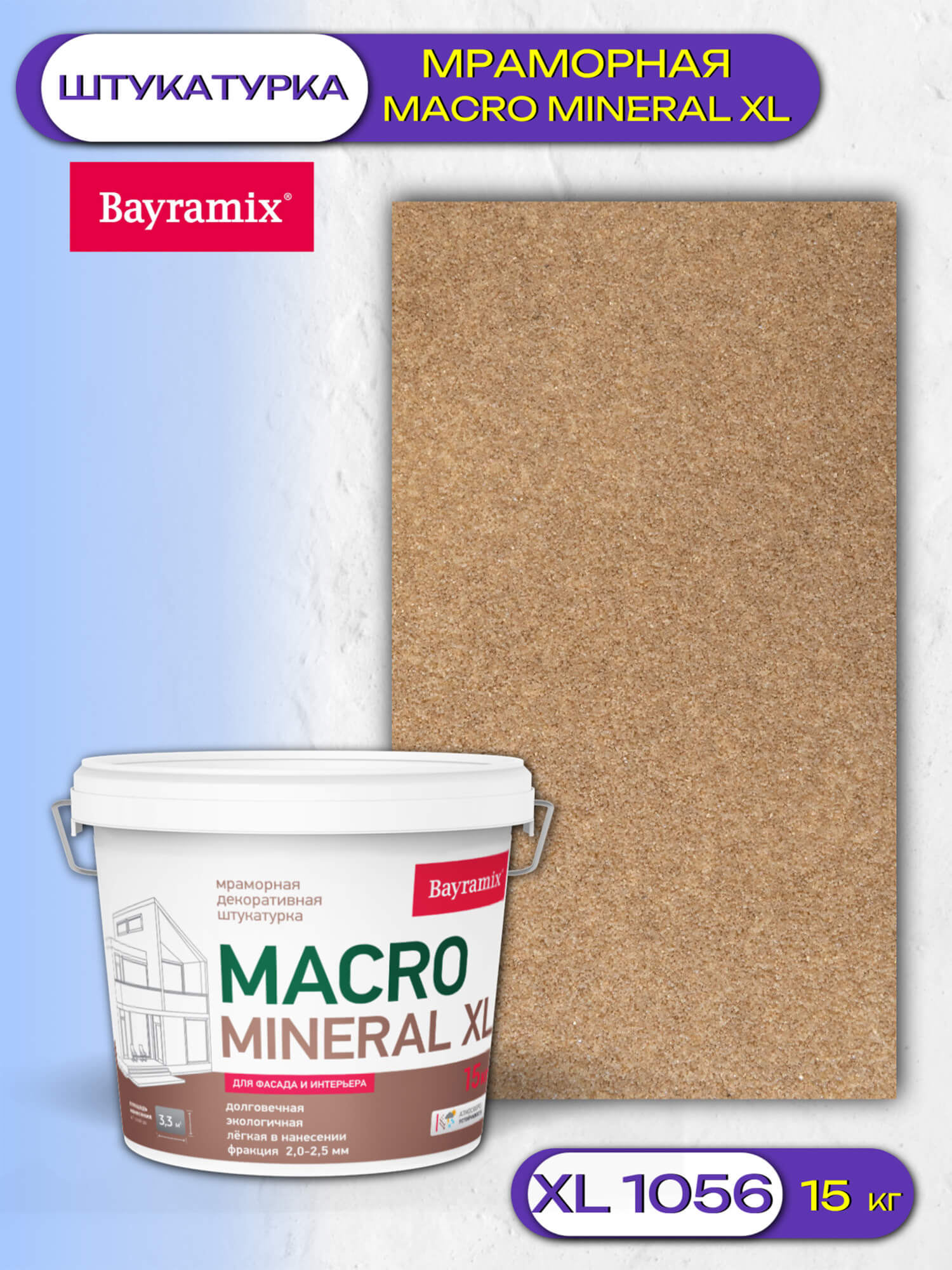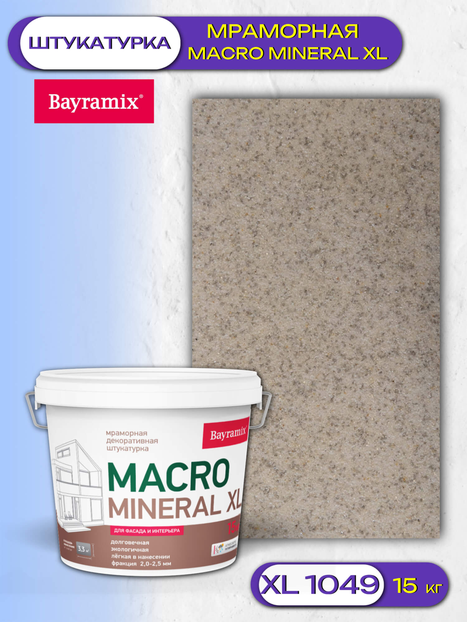 Декоративная мраморная штукатурка Macro Mineral Bayramix является инновационным материалом, способным создать впечатление натурального камня благодаря структуре крупной крошки мрамора, формирующей эффектное покрытие.