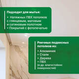 Universal Delicate подходит для мытья натяжных ПВХ потолков с глянцевым, матовым и сатиновым полотном, покрытий с фотопечатью, а также реечных и подвесных потолков из алюминия, стали, дерева, ПВХ и других влагостойких поверхностей. Не требует смывания.